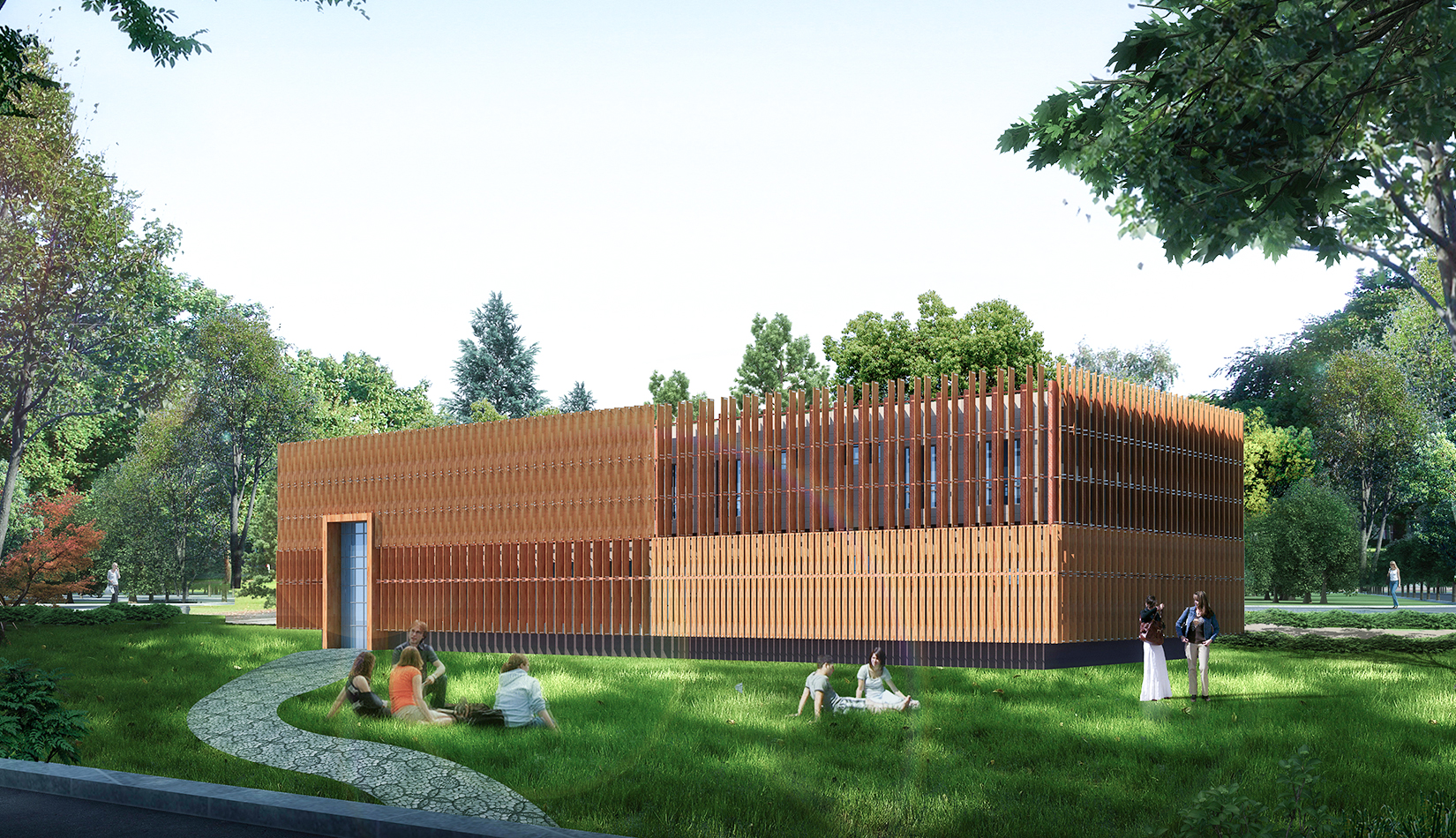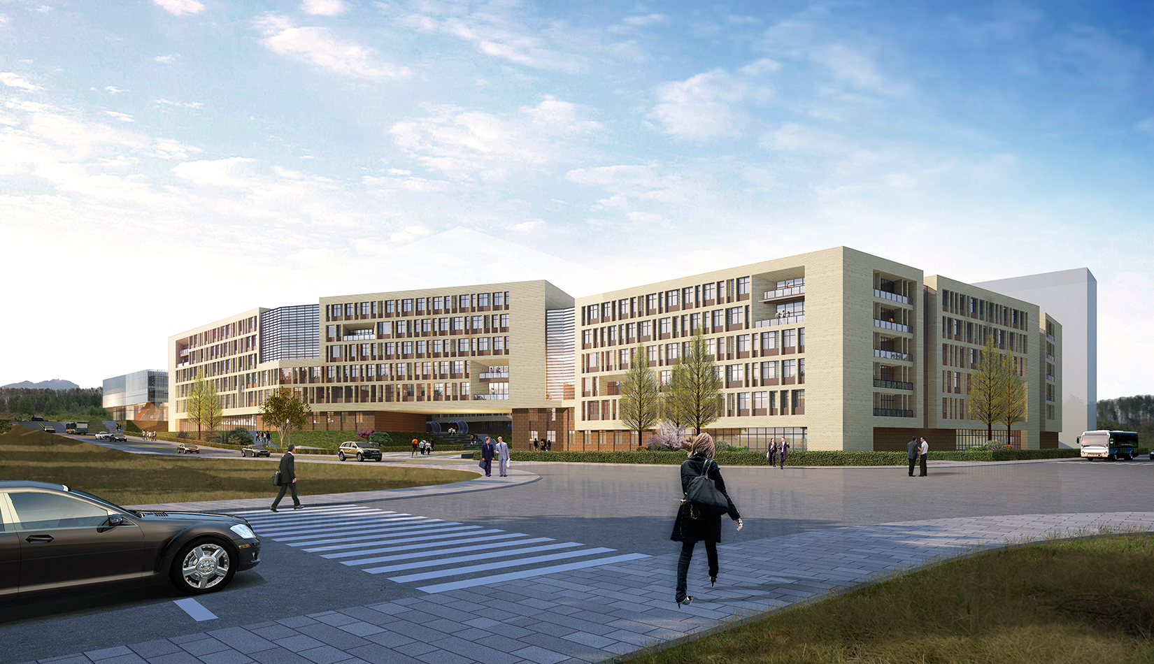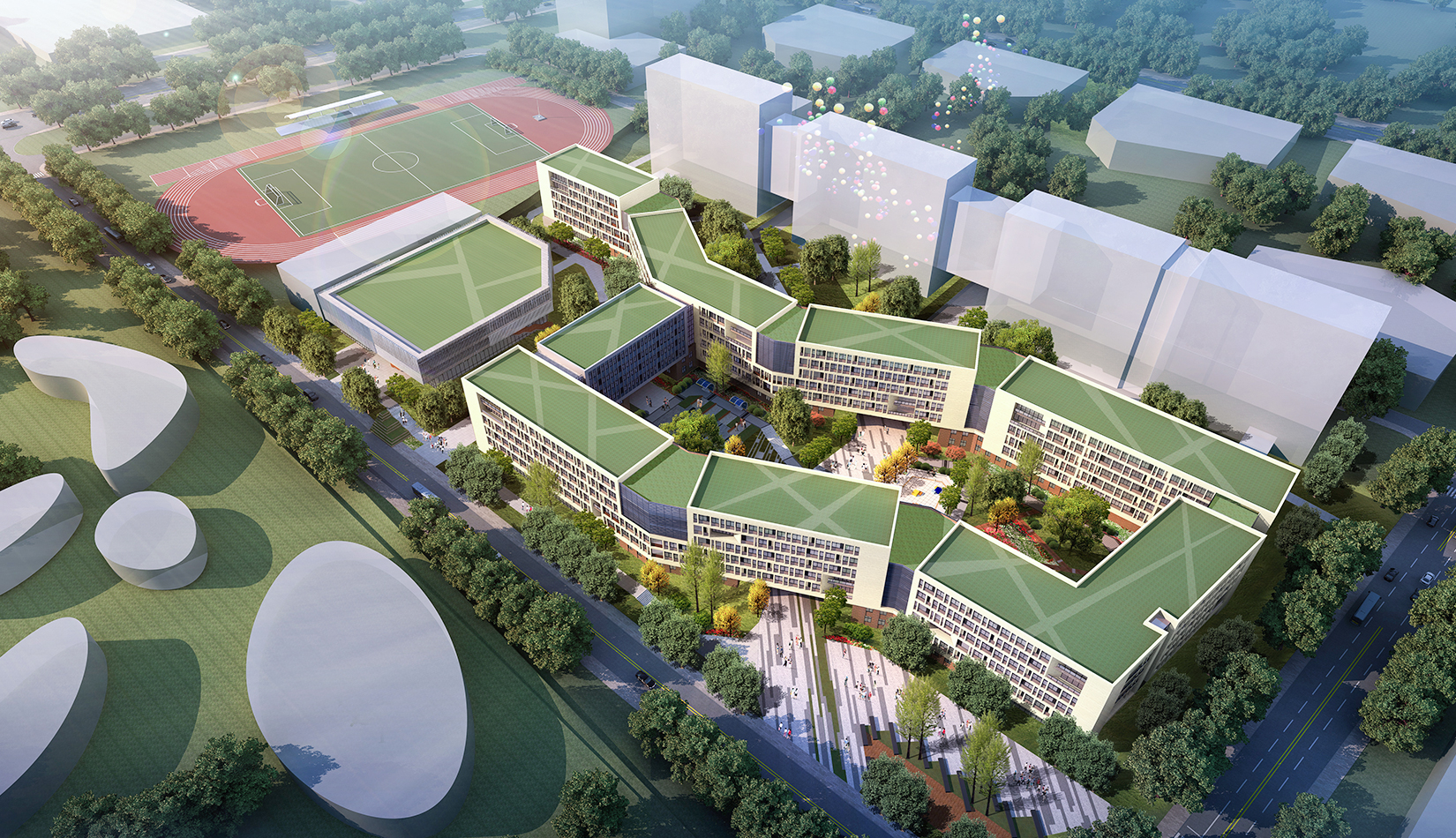 西區(qū)生活區(qū)順應(yīng)歐式建筑布局,采取 軸線景觀 設(shè)計(jì)手法,體現(xiàn)規(guī)整與有序的園林藝術(shù)特色。結(jié)合臺地景觀的設(shè)計(jì),營造大氣的室外空間。庭院設(shè)計(jì)主要以規(guī)整式布局為主,另在主樓后部林區(qū)采用自然式布局,做到規(guī)整與自然式相結(jié)合,在山水之間為學(xué)生提供良好的學(xué)習(xí)環(huán)境。