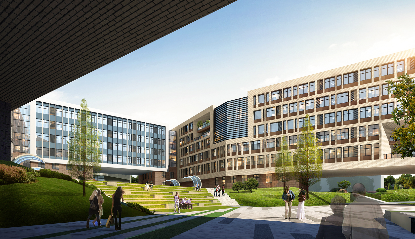 東區(qū)生活區(qū)庭院空間配合建筑設(shè)計(jì)的現(xiàn)代主義風(fēng)格,提取未來主義畫派的代表元素——線條 作為構(gòu)思的主脈絡(luò),以“理性與未來”為設(shè)計(jì)理念,在建筑圍合的景觀中庭采用現(xiàn)代景觀設(shè)計(jì),意在未來,情致校園 。