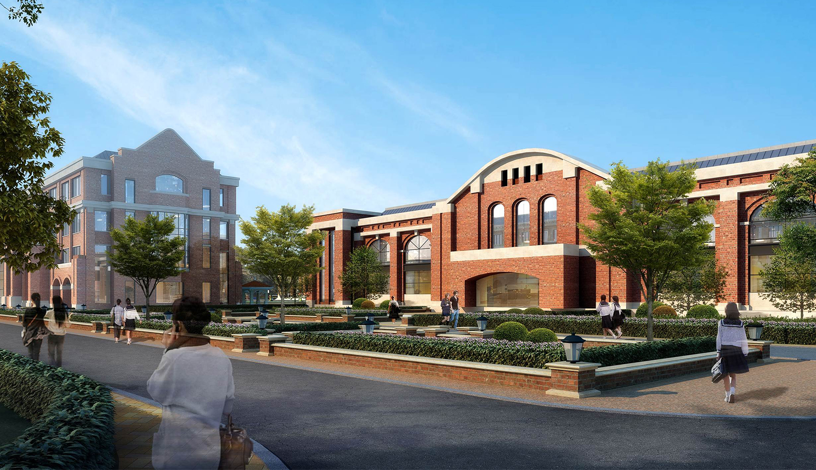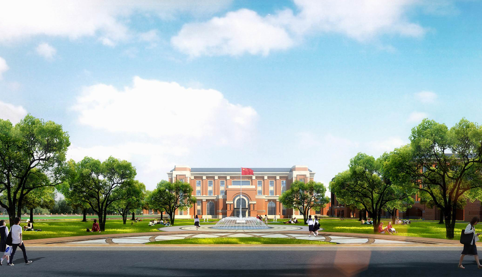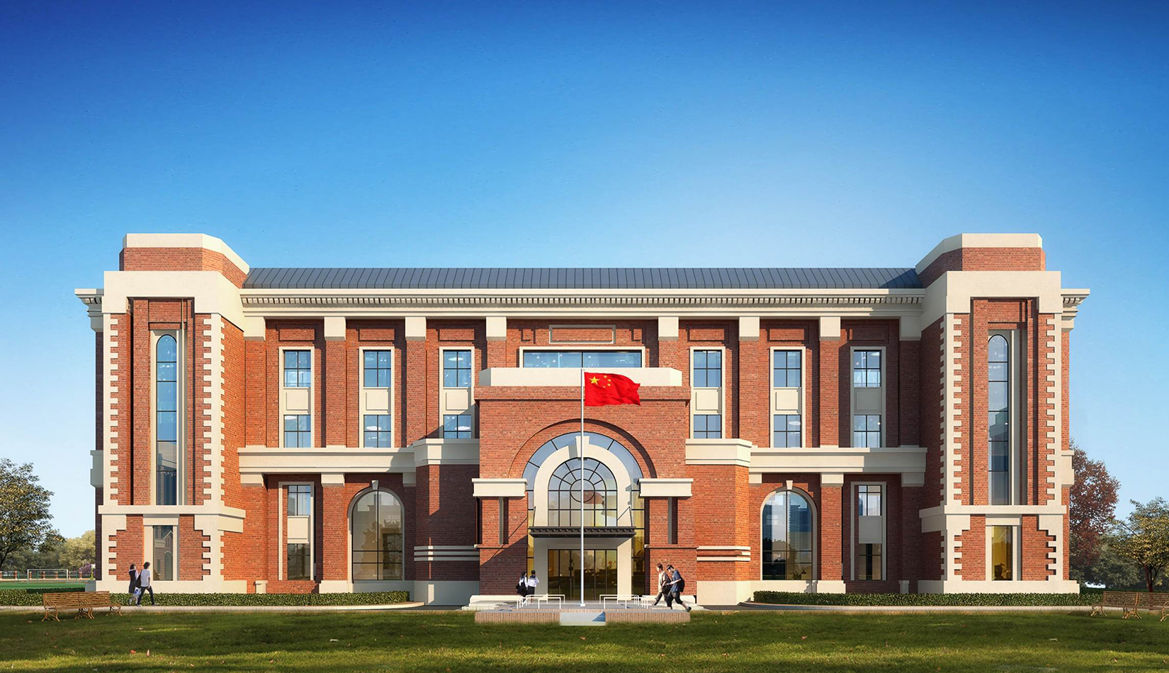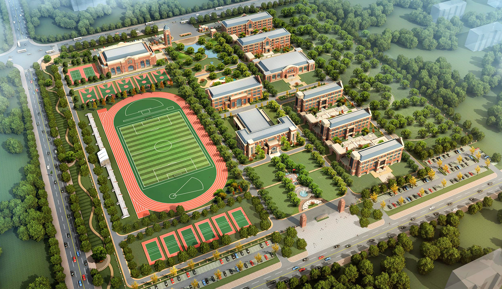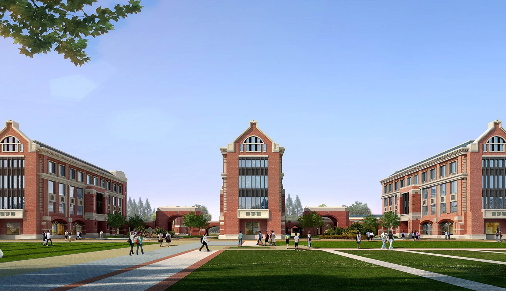 分區(qū)設(shè)計上,采用了“前場后園”的設(shè)計手法。前區(qū)以教學(xué)區(qū)為主,圍繞中心圖書綜合樓形成前區(qū)禮儀性廣場,同時以中軸對稱為原則,體現(xiàn)了教學(xué)的嚴(yán)肅性與秩序性;各個教學(xué)單元以年級、功能就近布置為基本原則,以中國傳統(tǒng)的“院落”形式進(jìn)行組合,后院生活區(qū)借鑒了“山水園林”的布局手法,結(jié)合中心景觀,進(jìn)行自由化布局,達(dá)到景入園中、人在景中生活場景,使學(xué)生在學(xué)習(xí)之余,得到充分的放松。