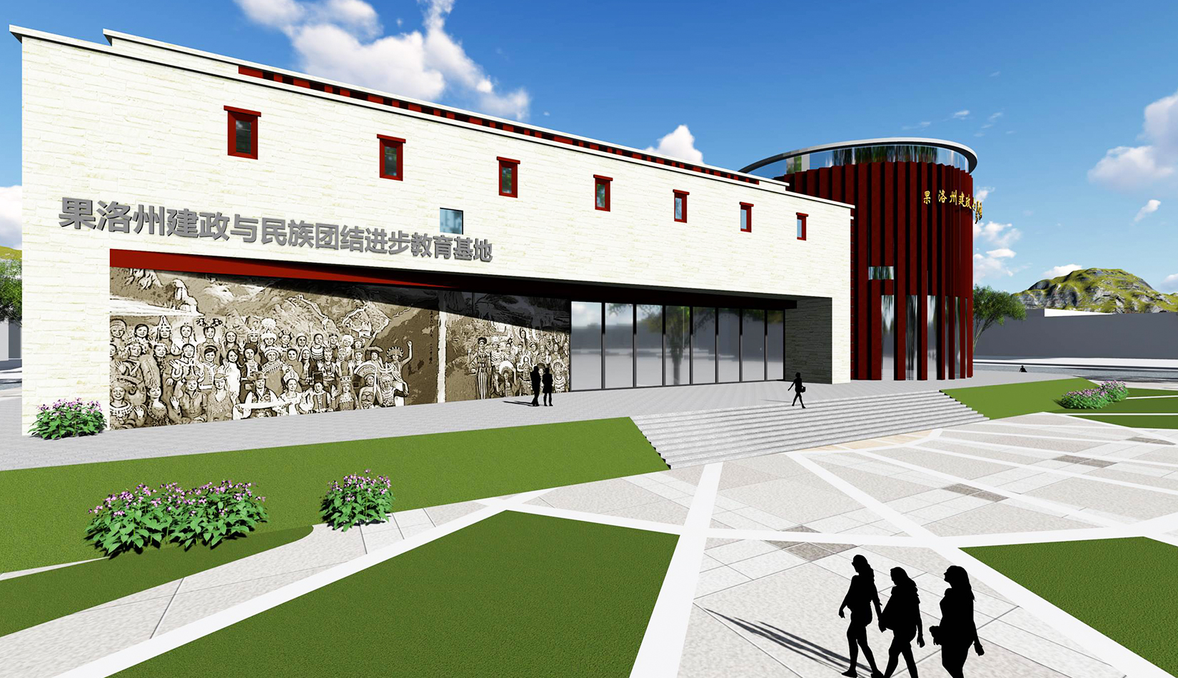 設(shè)計(jì)造型整體為中心聚攏的形態(tài),圓形體塊是建筑的核心,象征著黨的領(lǐng)導(dǎo),各分支體塊象征著分布在果洛的各個(gè)民族,體現(xiàn)出各民族團(tuán)結(jié)一心,同心向黨,在黨的領(lǐng)導(dǎo)下團(tuán)結(jié)一致、共同奮斗;另一方面,圓形體塊與各分支體塊的簇?fù)黻P(guān)系也象征著各民族緊密團(tuán)結(jié),永不分離。