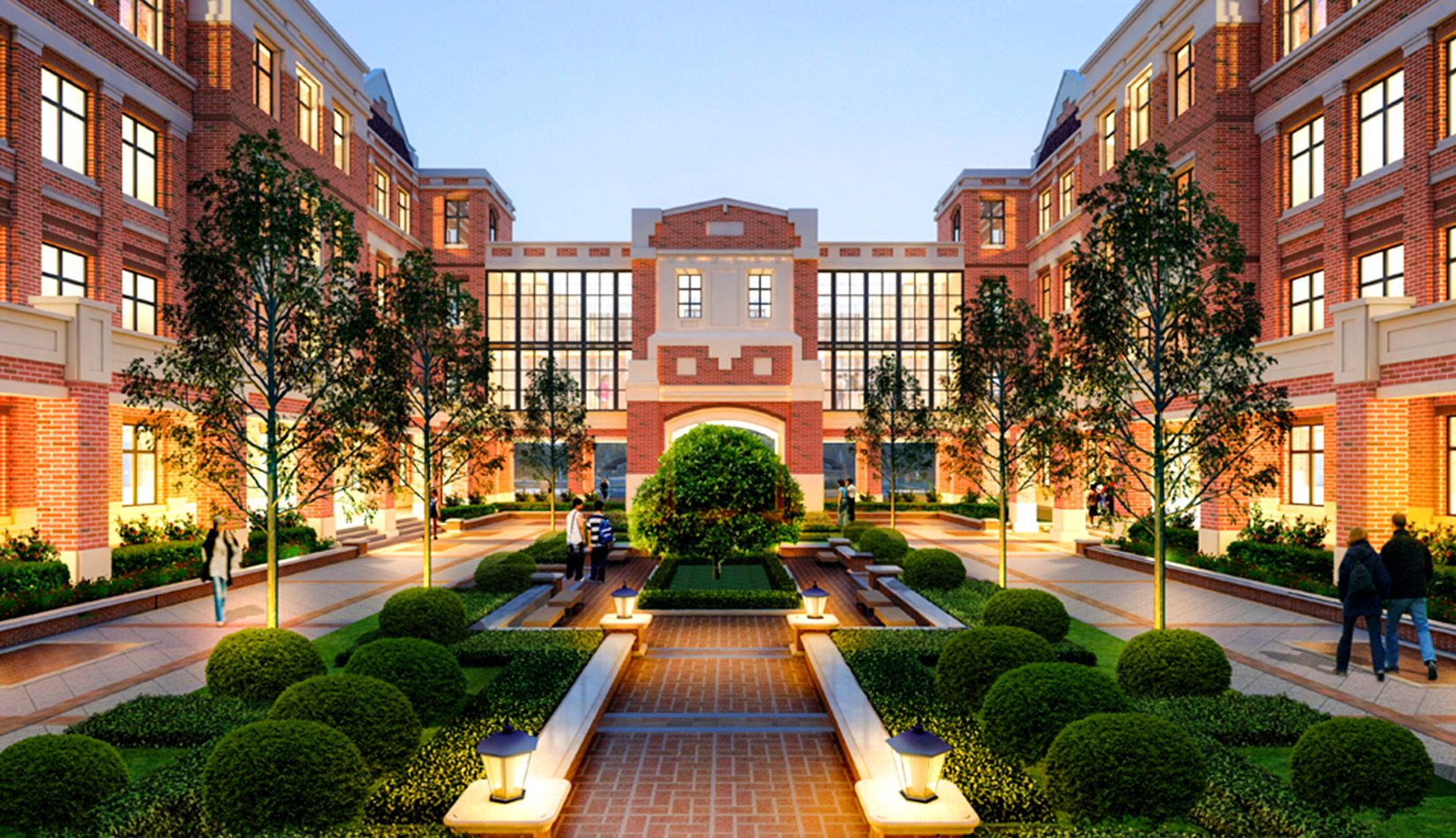學院派的院落空間布局: 規(guī)整的建筑軸線布局,古典的建筑界面,方整的院落交流空間,結(jié)合廣場、綠地,營造百年學府的低調(diào)。