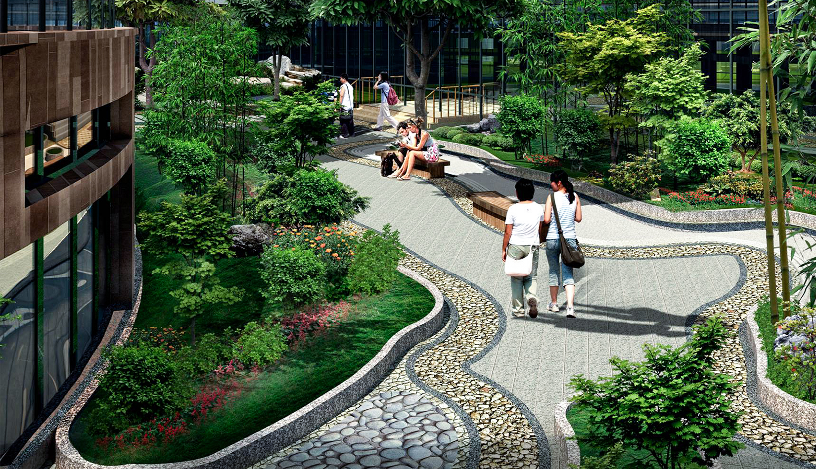 2. 綜合服務(wù)樓中心設(shè)計(jì)特色水景一處,潺潺的流水聲,增加整個(gè)入口空間的活潑歡快的氣氛。