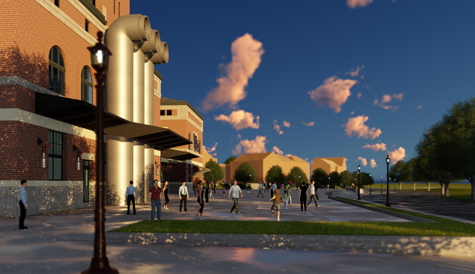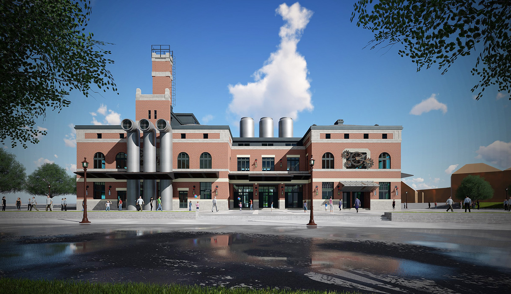紅磚是工業(yè)風(fēng)的最佳表現(xiàn)元素之一,本案選取紅磚作為立面主要材質(zhì),加以真石漆、石材進(jìn)行點綴,磚塊與磚塊中的縫隙可以呈現(xiàn)有別于一般墻面的光影層次。屋面形式選取深灰色瓦屋面加以深色金屬板點綴,與立面形成強(qiáng)烈的視覺對比,旨在體現(xiàn)工業(yè)風(fēng)的粗獷氛圍。