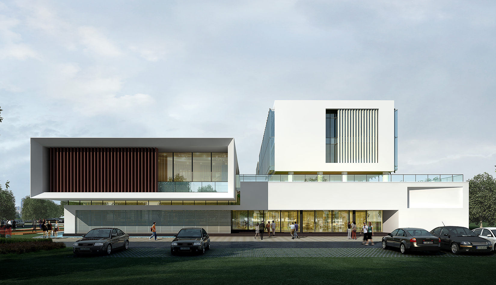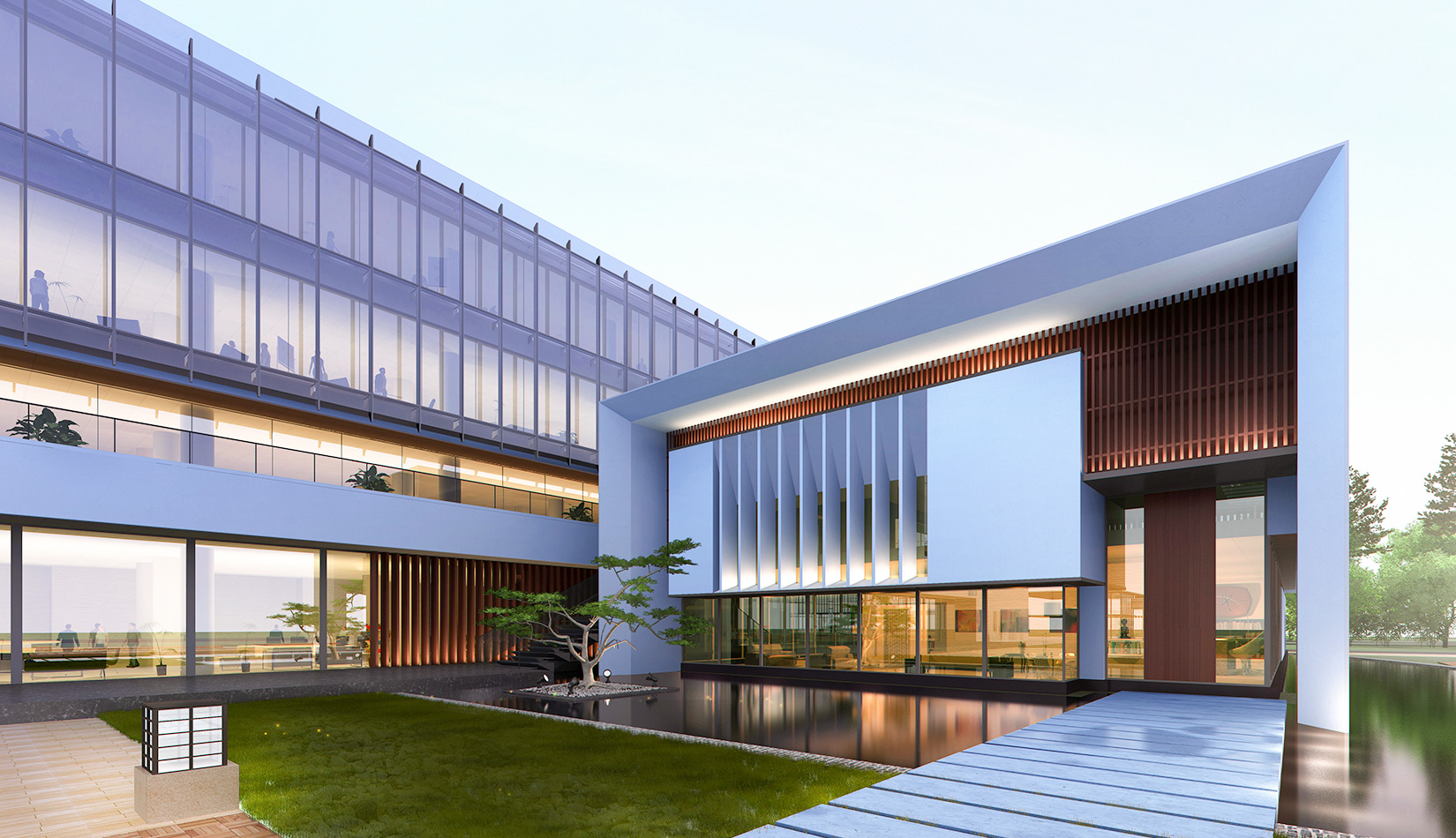 作為中韓貿(mào)易合作區(qū)一期啟動區(qū)的重點項目,其承擔著對外展示以及為后續(xù)發(fā)展提供服務(wù)平臺的功能。因此設(shè)計力求穩(wěn)重大氣,以4 層的體量打造出地標性的建筑。設(shè)計運用簡潔的外形、寧靜的色彩,外立面以白色涂料和木格柵為主,尊重自然,打造一種平和寧靜的感覺。在空間設(shè)計上通過共享空間、上人露臺和一層大平臺,創(chuàng)造出舒適宜人的工作環(huán)境;在技術(shù)上通過地源熱泵、呼吸式幕墻、雨水收集等的應用,實現(xiàn)建筑的綠色節(jié)能環(huán)保。